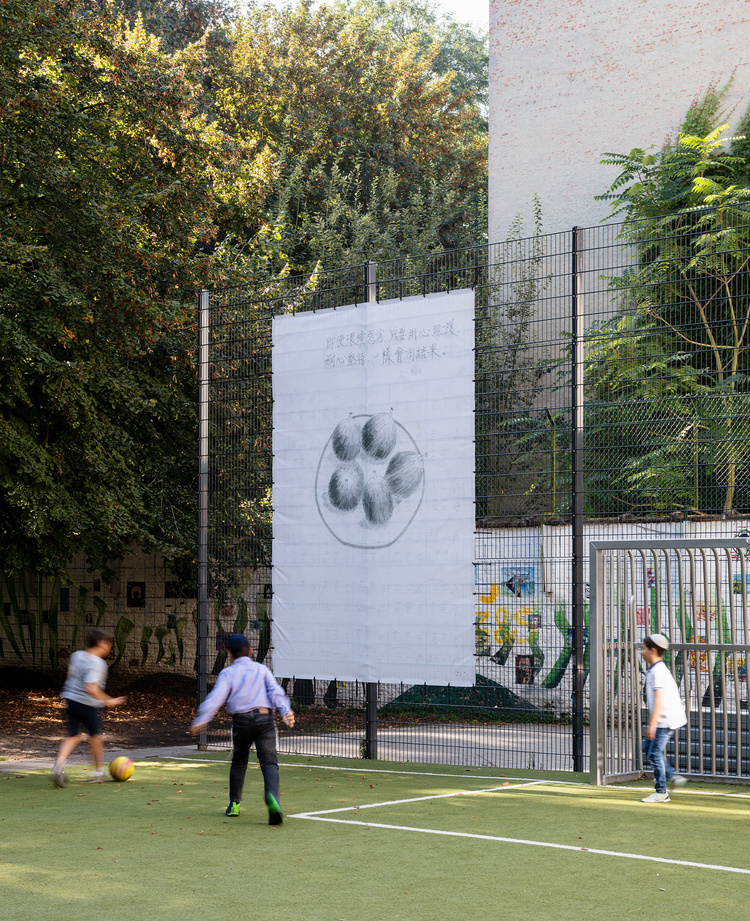 Pei-Hsuan Wang’s work Five Figs is placed on the fencing of the football field in Harmonie Park. The banner depicts the artist's mother’s drawing of five figs which she grew in her garden. It is made on the reverse side of a music sheet, creating a watermark-like effect that subtly permeates the image. The drawing is accompanied by a proverb written in Chinese: “Even under harsh conditions, with genuine care, patience, and persistence, one's efforts can come to fruition.”